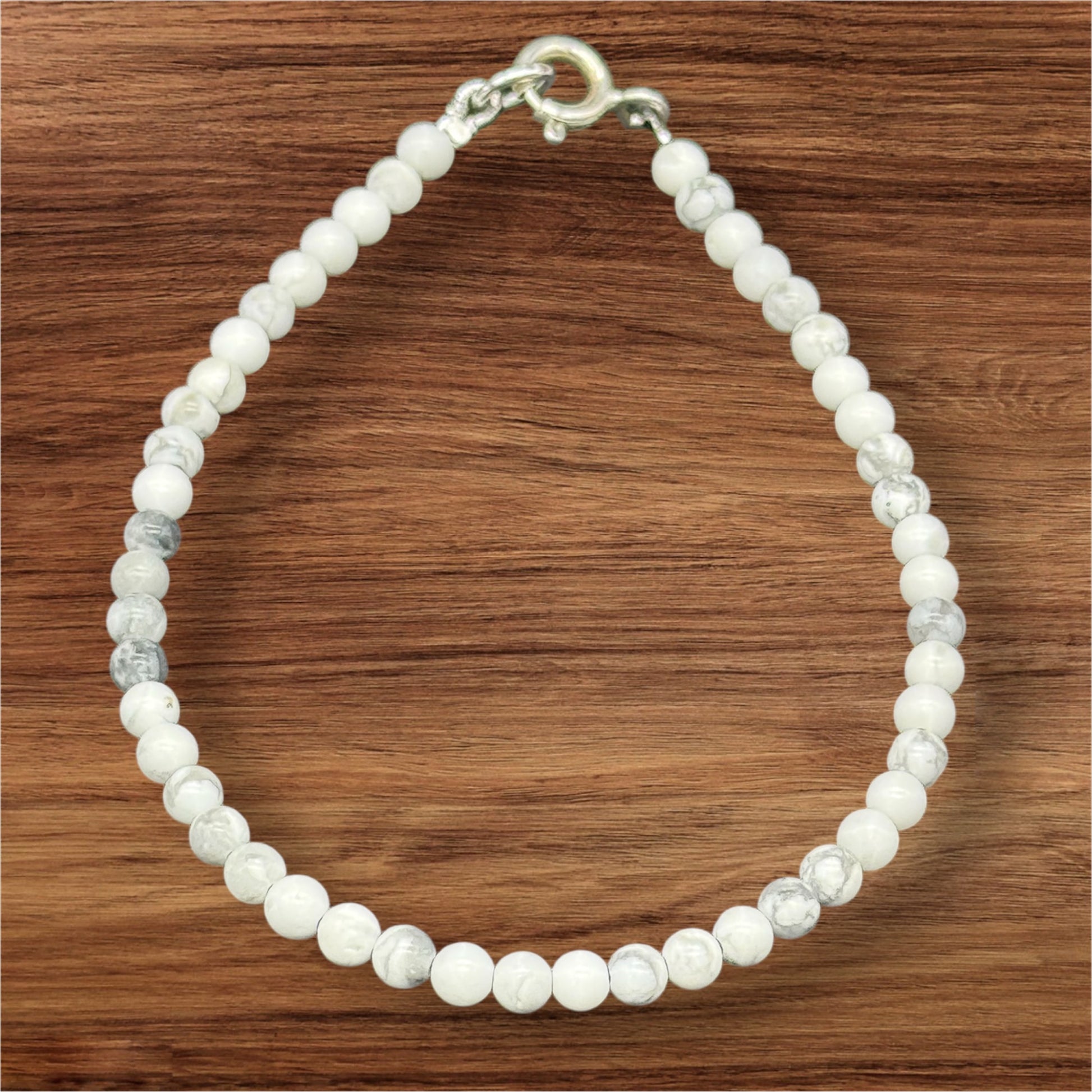 This beautiful bracelet is made of natural howlite beads in a soft white with characteristic gray veining. The carefully selected 4mm gemstone beads are perfectly complemented by an elegant 925 sterling silver clasp. At 18 cm in length, the bracelet sits comfortably on the wrist and adds a touch of understated, minimalist elegance to any outfit.