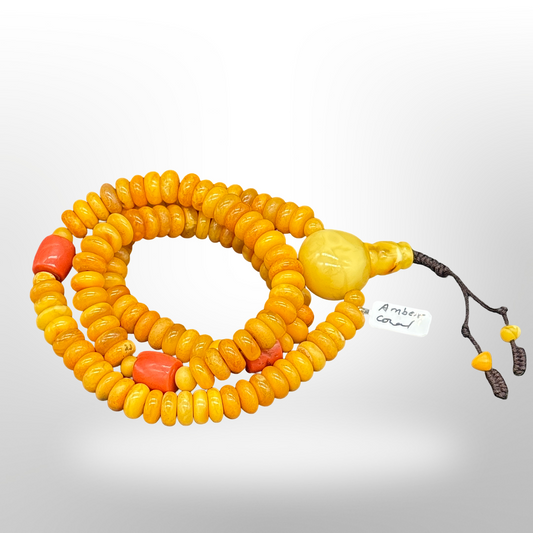 Chapelet en ambre naturel – Mala de 108 perles avec 3 perles de corail
