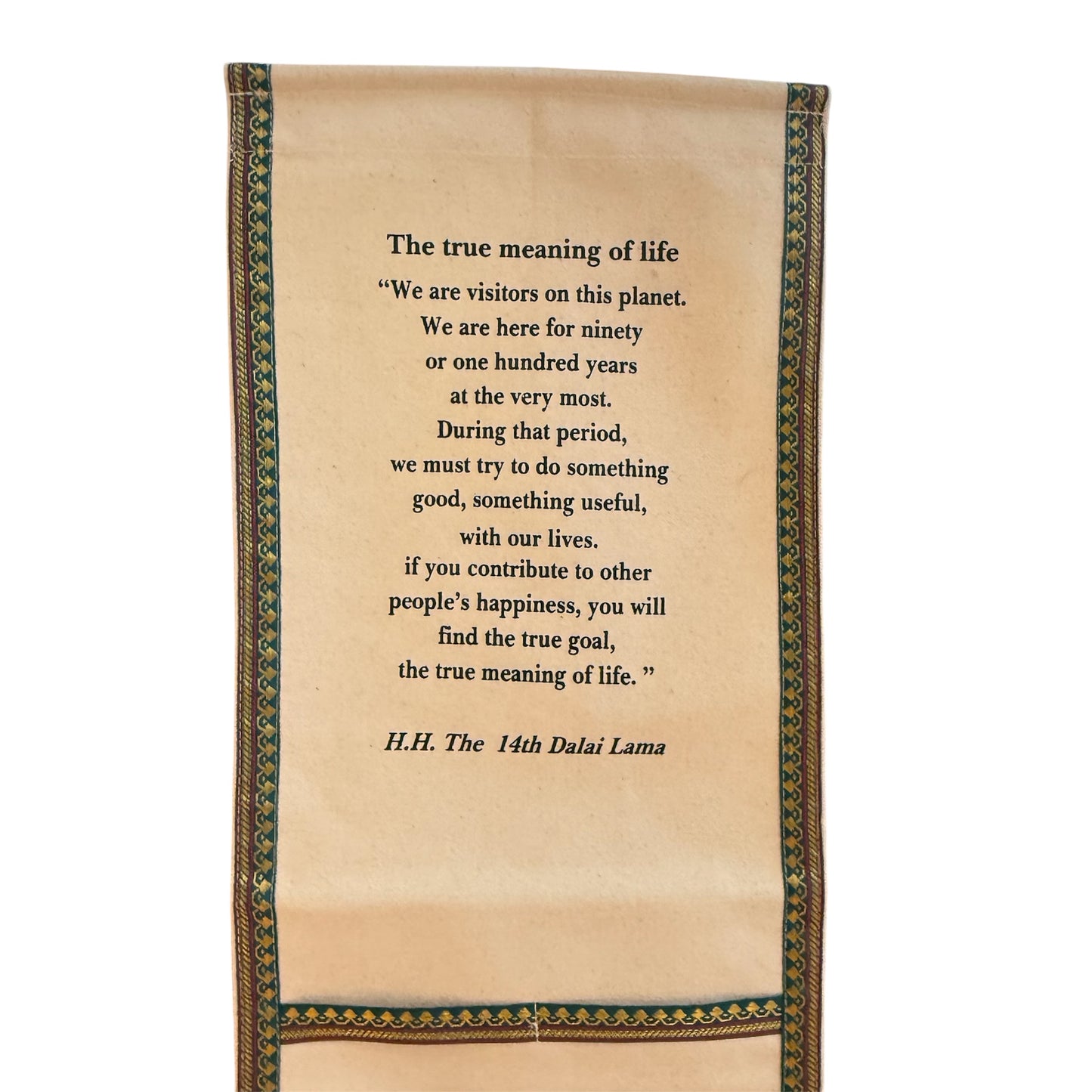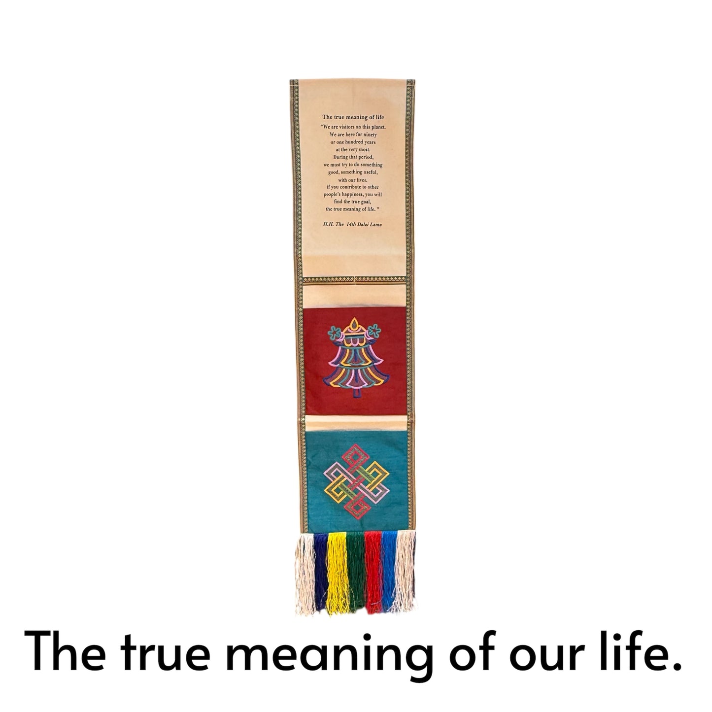 Cette bannière murale tibétaine de haute qualité est une pièce décorative inspirante au message profond. Elle porte la célèbre citation de Sa Sainteté le 14e Dalaï-Lama sur le véritable sens de la vie :